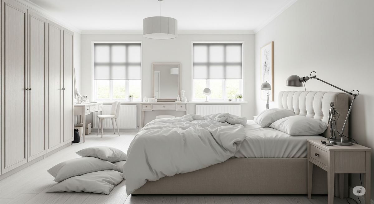 Ошибка: Яркое освещение и отсутствие текстиля могут сделать спальню непригодной для отдыха. Использование холодных белых ламп и простыней, напоминающих больничные, лишь подчеркивает это.