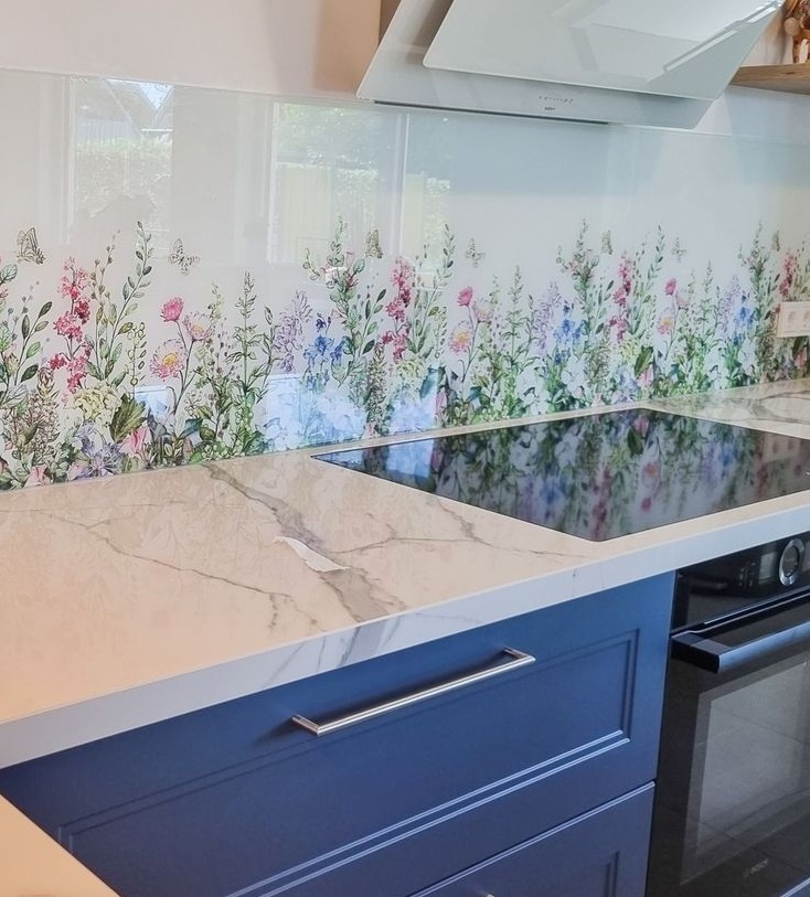 Модным решением для фартука стали стеклянные панели с красивыми текстурами и рисунками. Это могут быть как геометрические узоры, так и романтичные цветочные мотивы. Такие фартуки не только легко чистятся, но и визуально увеличивают пространство, придавая кухне легкость и современный вид. Стекло можно комбинировать с различными обоями или тканями, защищая их от влаги и загрязнений. Главные преимущества такого решения: