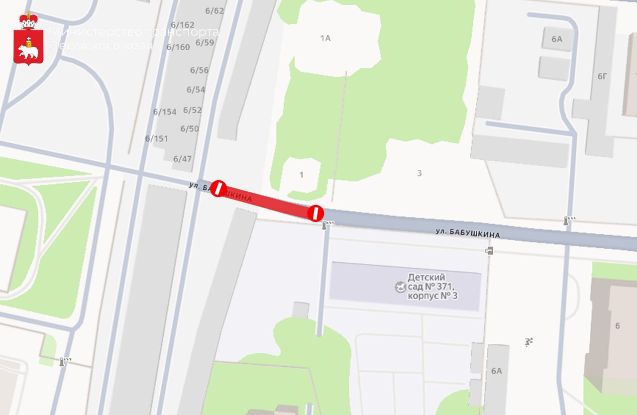 Обращаем ваше внимание, что с 19 до 31 января ВРЕМЕННО ЗАКРЫТО ДВИЖЕНИЕ ТРАНСПОРТА по ул. Бабушкина (от дома № 4 по ул. Бабушкина до ул. Нытвенской), отметили участок на карте. Особенно это перекрытие коснется тех, кто выезжает через промзону с шоссе Космонавтов.