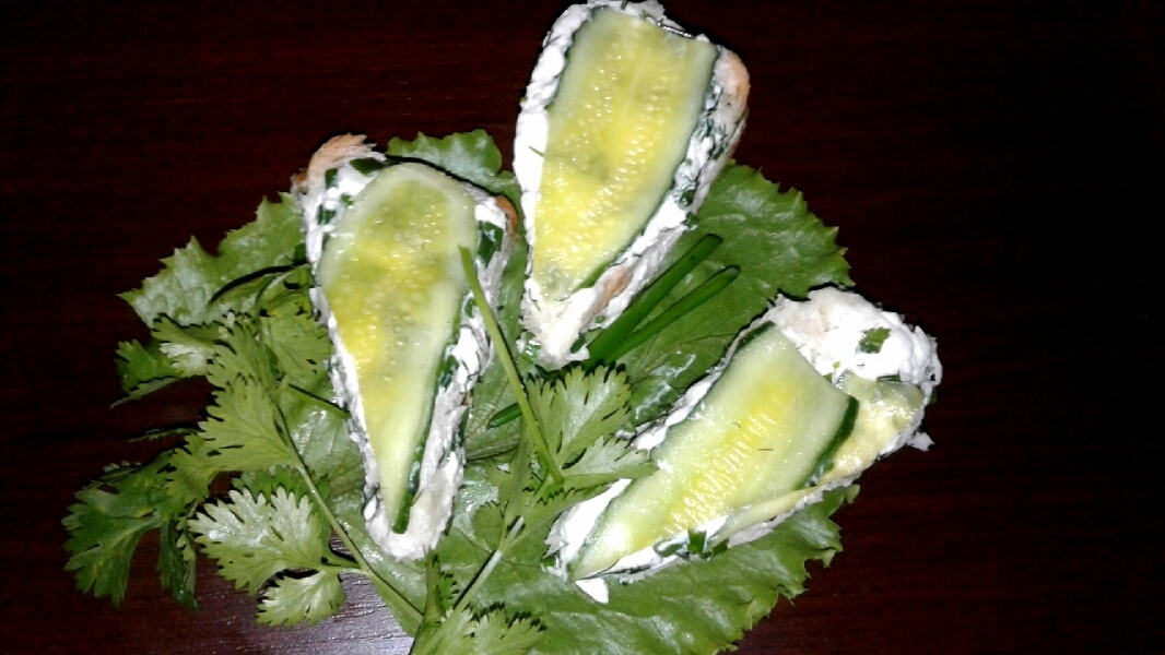 Также можно нарезать на маленькие кусочки. Свежий огурец в сочетании с чесночным ароматом творожного сыра делают этот бутерброд совершенно непростым. Приятного аппетита!