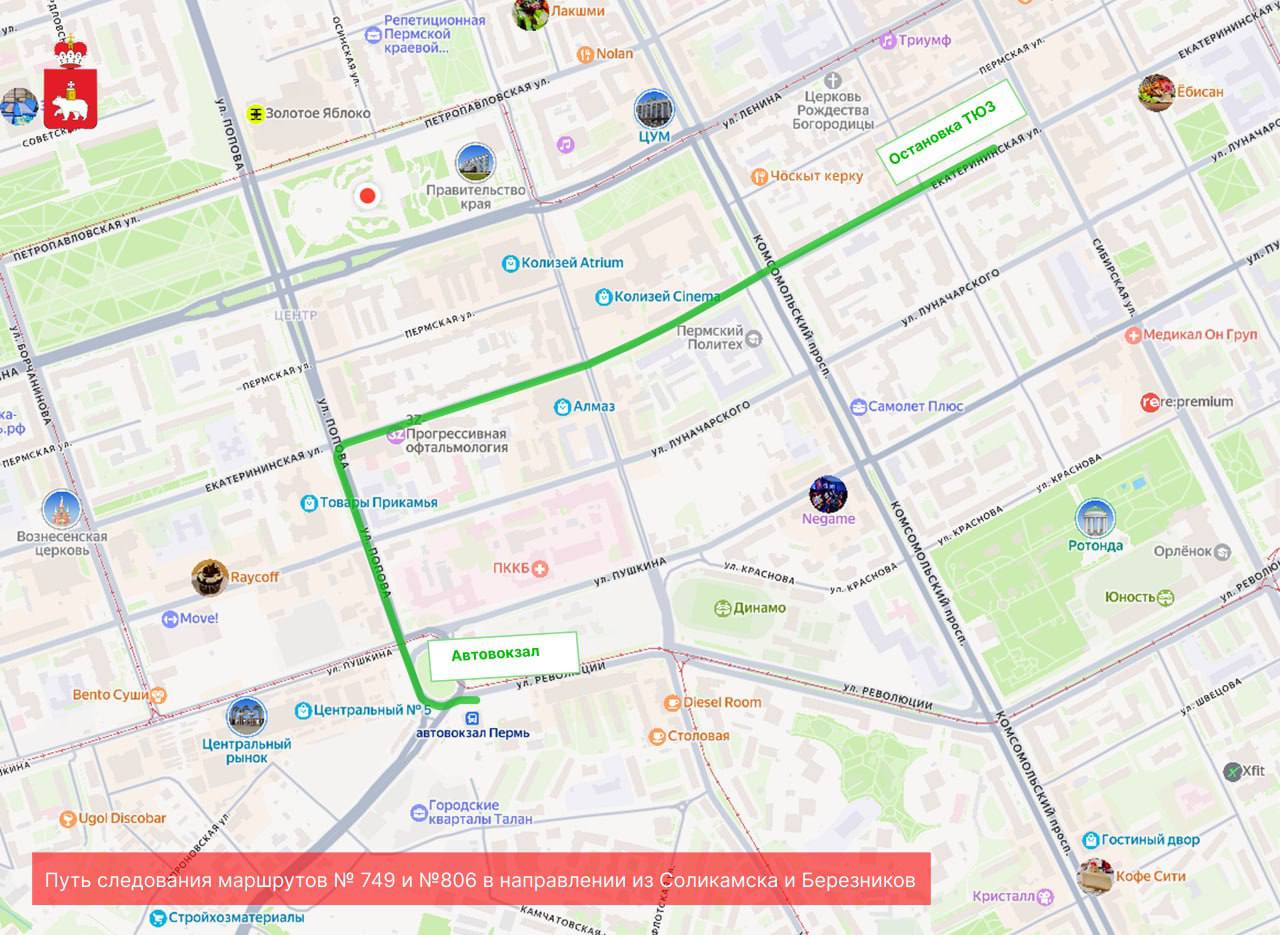 Автобусы проследуют по улицам Екатерининской, Попова и Революции до автовокзала г. Перми.