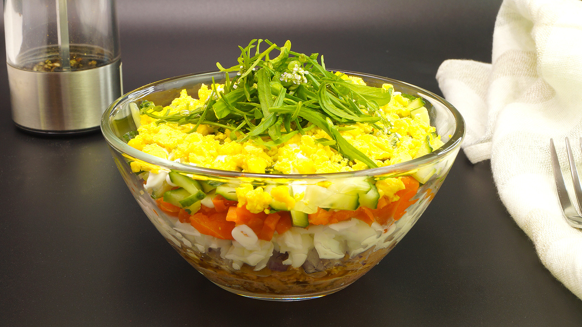 Этот салат впечатляет своим насыщенным вкусом и красивым видом. Попробуйте приготовить и поделитесь впечатлениями!