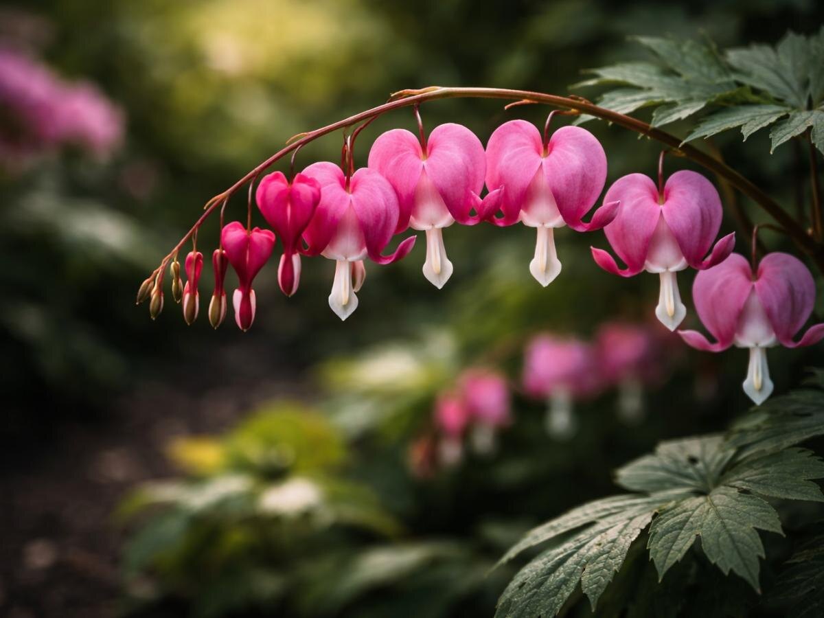 Цветение дицентры начинается в конце весны — начале лета, когда на изогнутых цветоносах появляются цветы, напоминающие сердечки. Эти уникальные цветы могут быть розовыми, белыми или с легким красноватым оттенком, в зависимости от сорта. Несмотря на то, что цветы держатся всего несколько недель, они создают легкость и воздушность в саду. А после цветения дицентра не теряет своей привлекательности, оставаясь аккуратным и зеленым акцентом на участке.