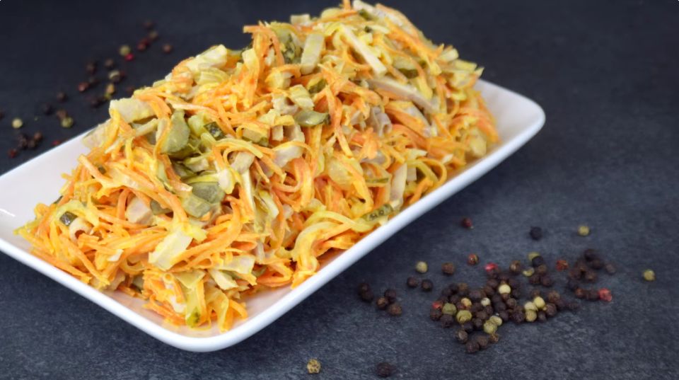 Маринованные огурцы нарежьте соломкой. Все подготовленные ингредиенты перемешайте в кастрюле, добавьте мясо, огурцы, обжаренные овощи и заправьте майонезом. В итоге вы получите салат, который отличается простотой и безусловным вкусом. Чтобы ингредиенты лучше сочетались, дайте ему настояться в холодильнике 30-40 минут.
