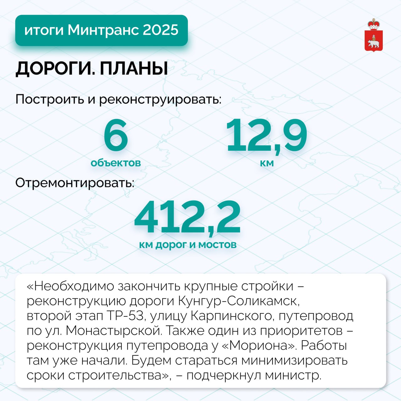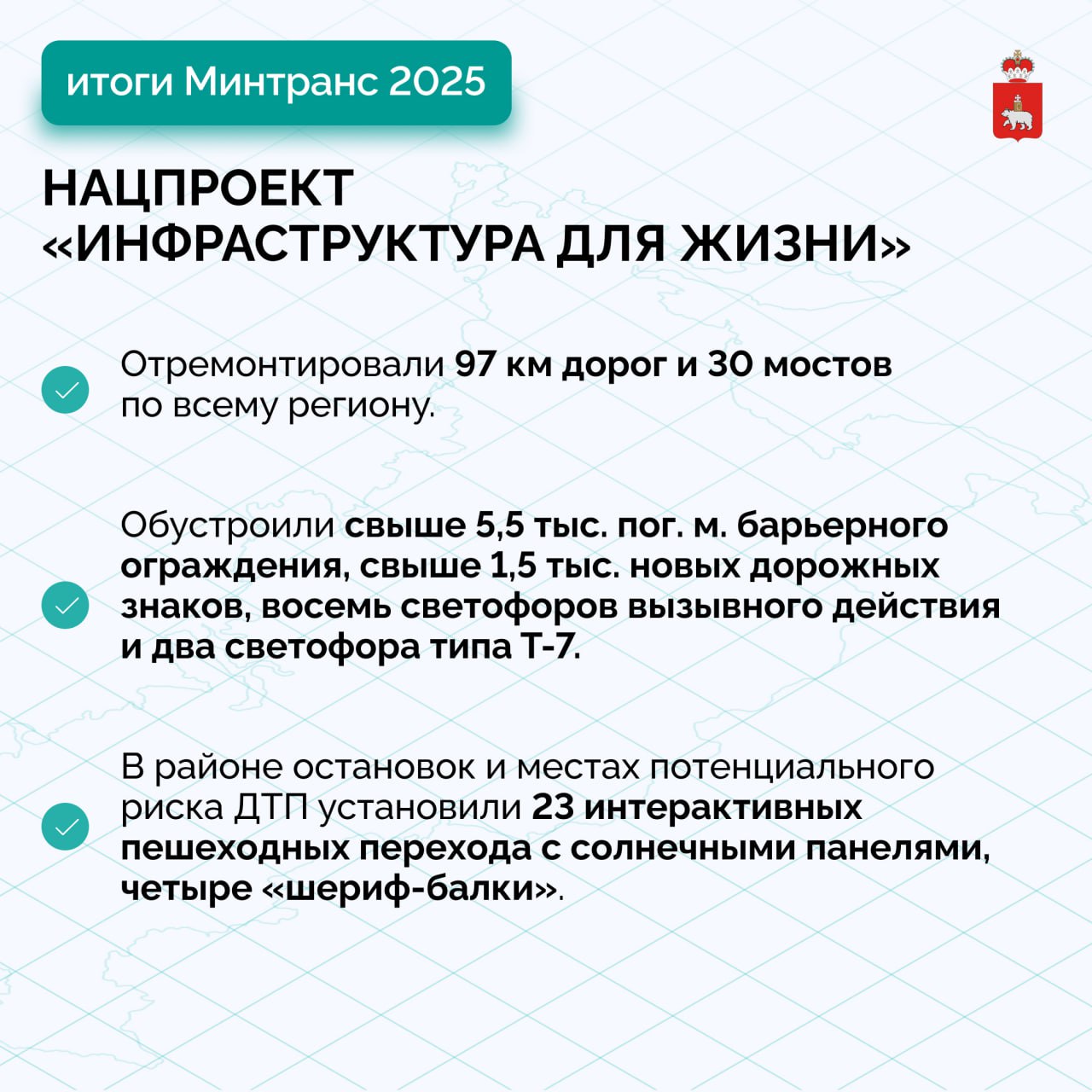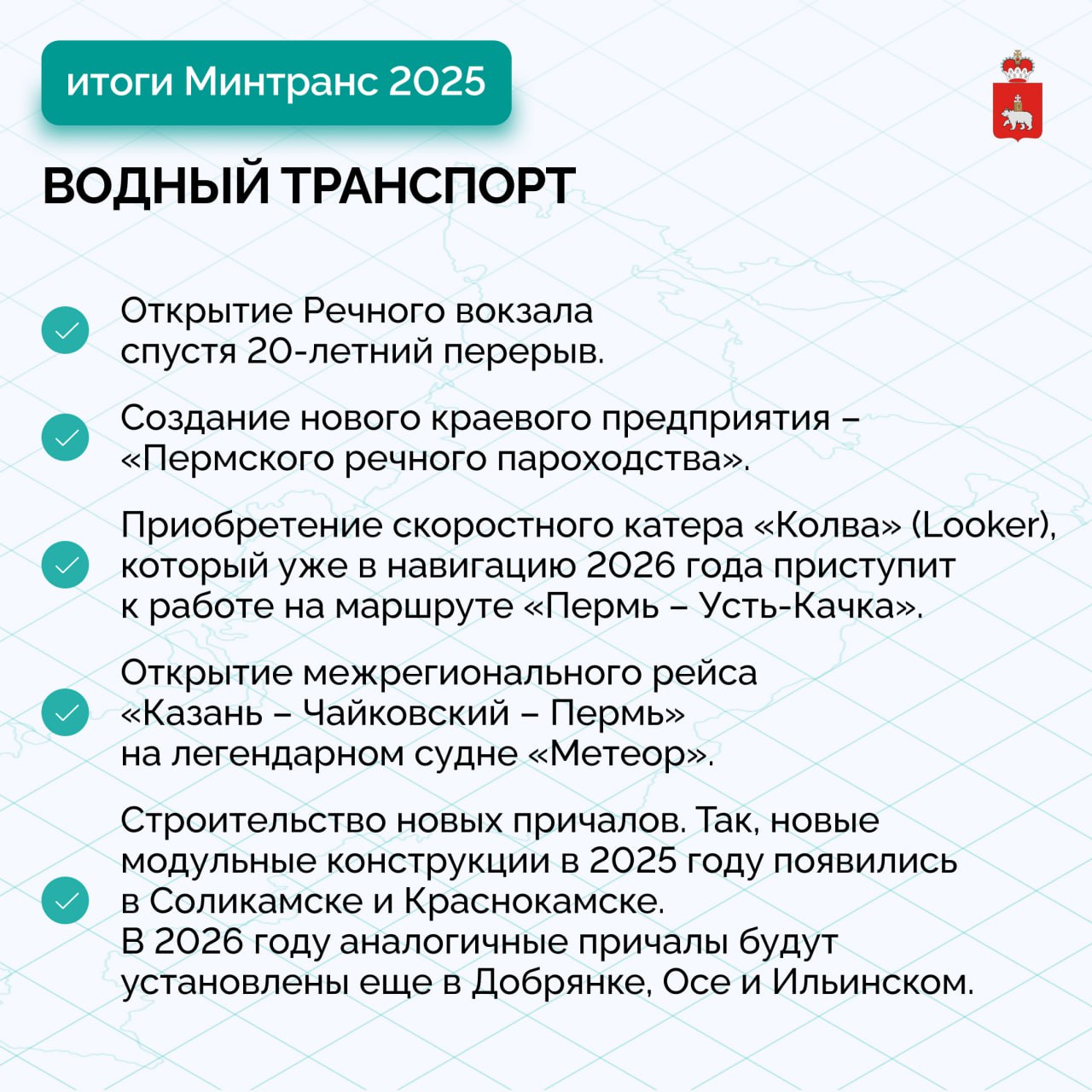 В качестве приоритетов на 2026 год он обозначил также развитие водных пассажирских перевозок и инфраструктуры, обновление контрактов по межмуниципальным маршрутам и реализацию регионального проекта Светлый край. В прошлом году в рамках первого этапа построили освещение на участках региональных трасс, проходящих через 17 населенных пунктов. В этом году необходимо в установленные сроки построить освещение еще в 54 населенных пунктах и с опережением заходить в план 2027 года.