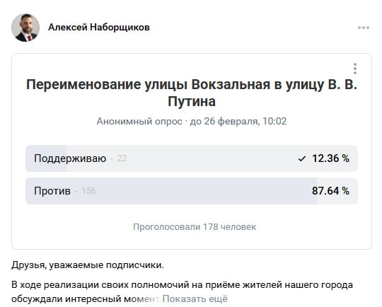 Депутат от КПРФ запустил опрос в VK о переименовании одной из центральных улиц города, Вокзальной, в улицу В.В. Путина. Но горожане идею не поддержали.