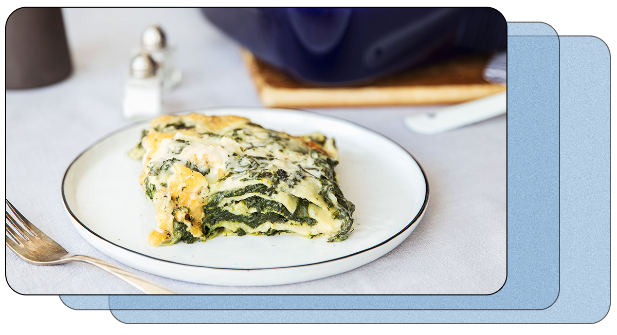 Приготовление: Куриное филе отварить до готовности, остудить и нарезать кубиками. Обжарить лук с чесноком, затем добавить шпинат и тушить несколько минут. Приготовить соус бешамель, постепенно вводя молоко к муке и маслу. В форму выкладывать соус, листы лазаньи, курицу и шпинат, перемежать слоями. Запекать 30 минут при 180 °C.