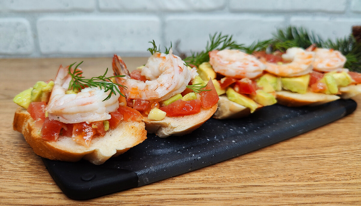 На подготовленные ломтики багета аккуратно выкладываем овощную начинку, помещаем сверху креветку и украшаем веточкой укропа. Закуска готова — идеальное решение как для праздника, так и для уютных вечеров с друзьями.