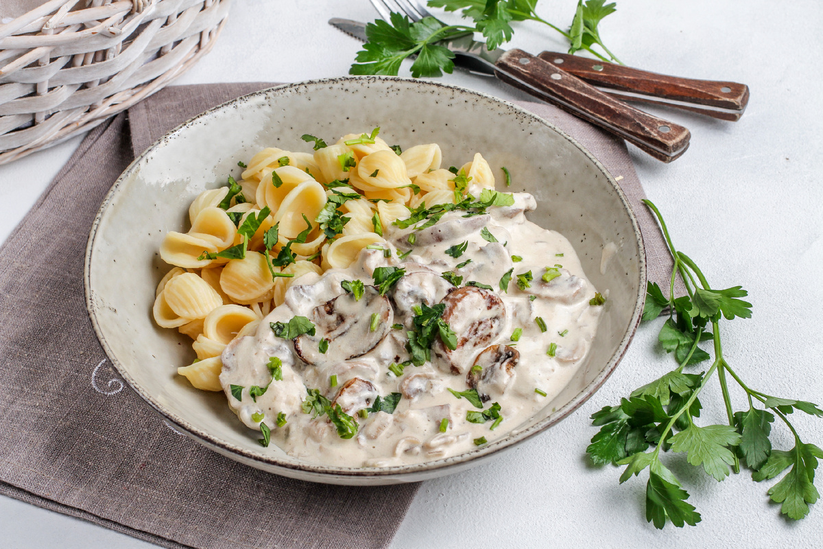 Шаг 1: Вскипятите 2 литра воды в кастрюле и добавьте немного соли. Забросьте пасту орекьетте в кипящую воду и готовьте на сильном огне 8-9 минут, периодически помешивая, чтобы она достигла состояния аль денте. После этого слейте воду и верните пасту в кастрюлю, предварительно перемешав с растительным маслом, чтобы она не слиплась. Пока паста варится, нарежьте мелко лук и чеснок. Шампиньоны не мойте, достаточно протрёте их бумажной салфеткой и нарежьте дольками. Разогрейте глубокую сковороду, добавив сливочное и немного растительного масла, чтобы предотвратить подгорание. Обжарьте лук, чеснок и веточку тимьяна на среднем огне в течение 2-3 минут. Затем добавьте шампиньоны и готовьте ещё 3-4 минуты. Всыпьте муку и хорошо перемешайте, затем влейте грибной бульон и дайте ему закипеть на протяжении 3-4 минут.