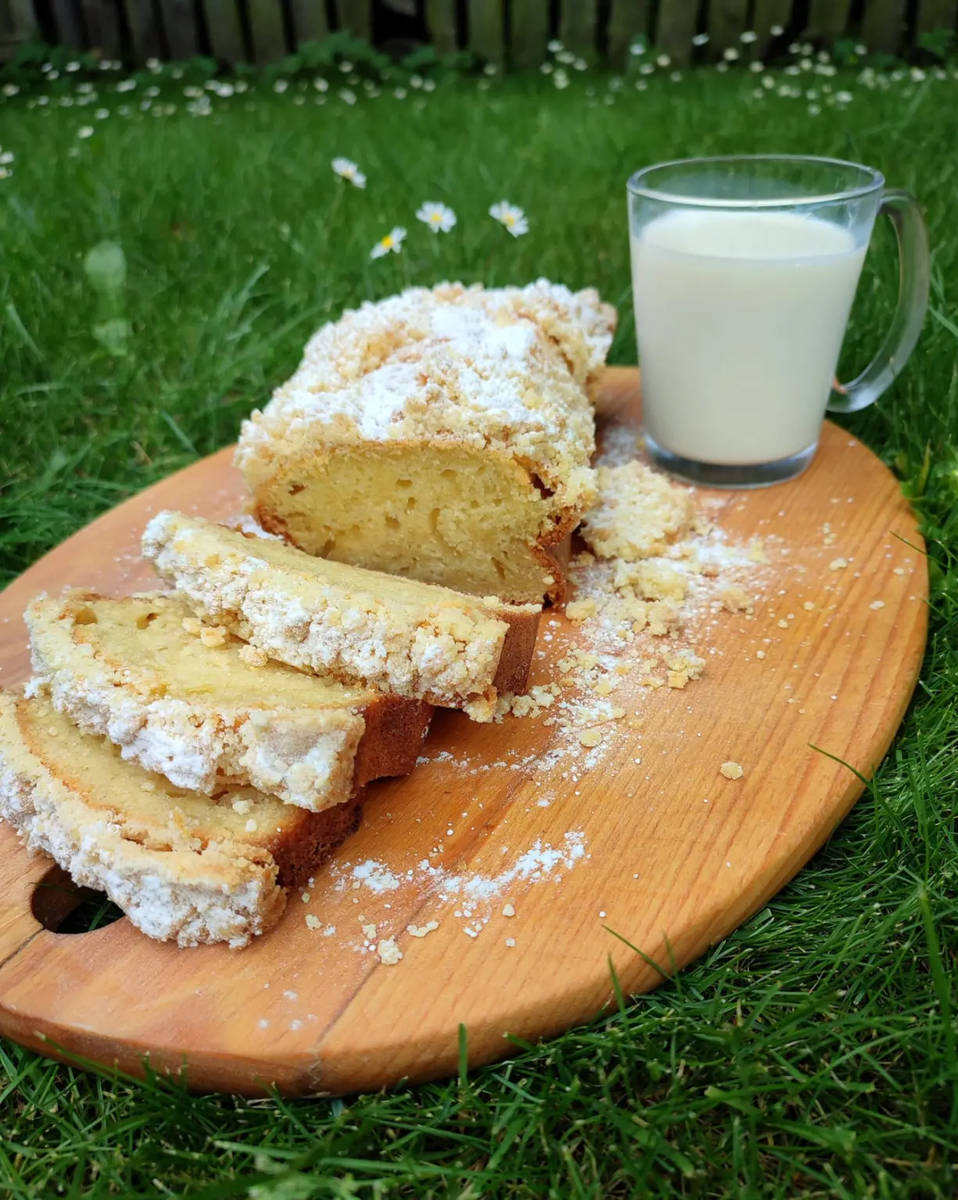Разогрейте духовку до 180 °C и посыпьте тесто крошкой. Выпекайте пирог около 40 минут, пока зубочистка не выйдет чистой из готового изделия. После выпекания дайте кексу немного остыть на решетке, чтобы он не потерял свою потрясающую текстуру.