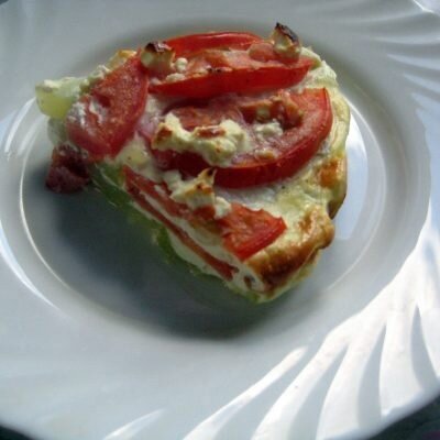 Сверху разложить нарезанные помидоры, а затем добавить слоями кусочки сыра «Фета». Повторить слои два раза.