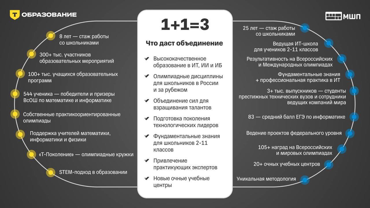 По оценкам компании, создание аналогичной системы с нуля потребовало бы не менее 5 лет. Ученики школы ежегодно становятся победителями и призерами всероссийских и международных олимпиад по техническим дисциплинам. Теперь методики и IT-платформа МШП станут базой для образовательной экосистемы Т-Технологий, при этом сохранится весь преподавательский состав школы и ее собственный бренд.