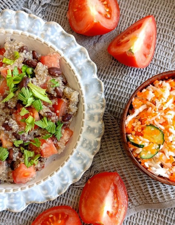 Фасоль удобно предварительно сварить порционно, чтобы она всегда была под рукой. Киноа требует минимального времени приготовления, и объединение двух базовых продуктов даёт полноценный обед без лишних хлопот. Салат из помидоров и зелени добавляет свежести и завершает композицию.