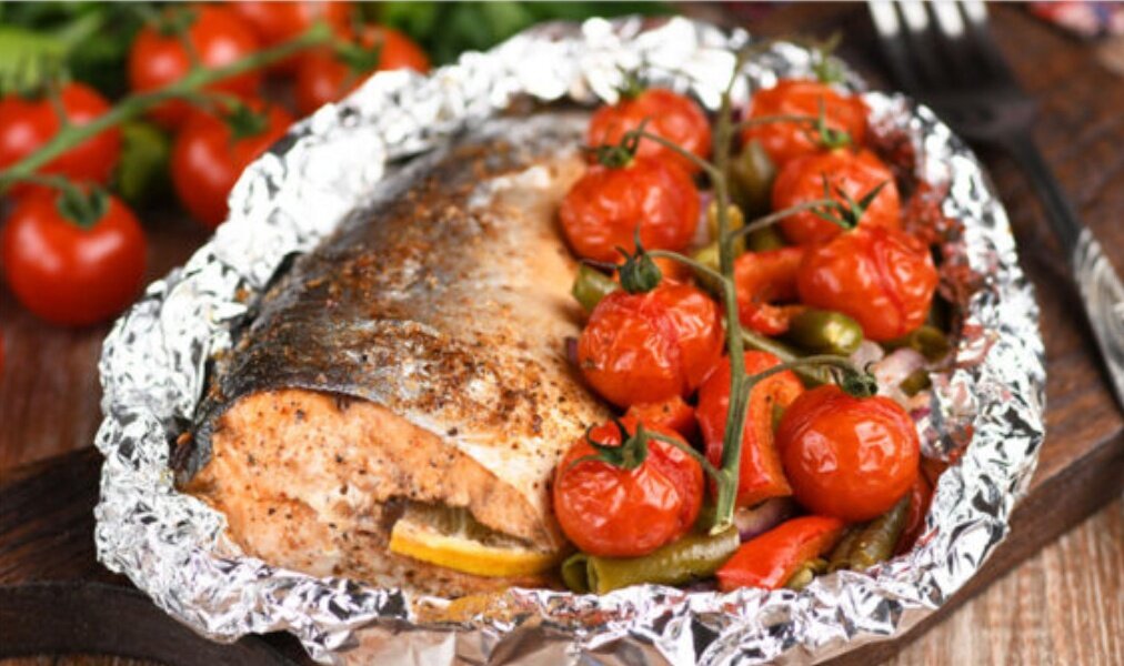 5. Заверните фольгу вокруг рыбы и овощей. Чтобы сделать блюдо более праздничным, можно украсить сверху веточками помидоров черри, которые можно заменить обычными томатами, нарезанными кусочками.