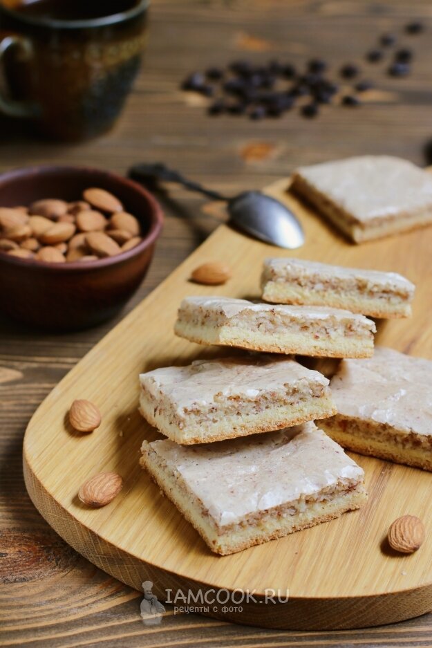 Равномерно распределить миндальную массу по остывшему коржу и оставить на 15 минут. После этого отправить печенье в предварительно разогретую до 160 градусов духовку на 30 минут.