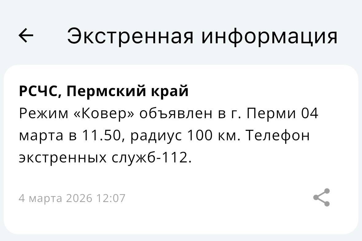 В краевой столице ввели режим «Ковер» в радиусе 100 километров, сообщает МЧС России. Одновременно в международном аэропорту «Пермь» (Большое Савино) установлены временные ограничения на прием и выпуск воздушных судов. Как уточняют в Росавиации, меры приняты для обеспечения безопасности полетов.