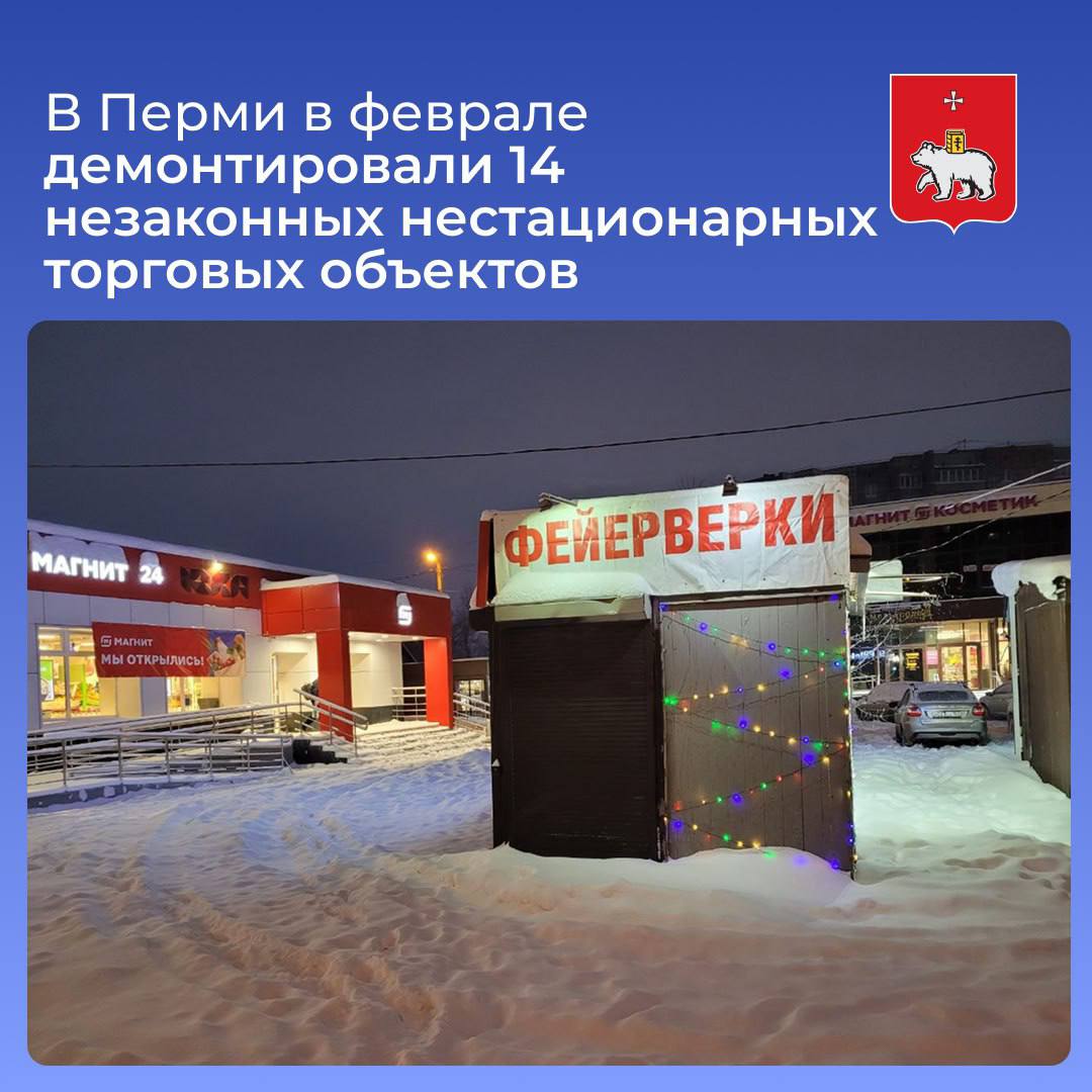 В Перми в феврале демонтировали 14 незаконных нестационарных торговых объектов. Большая часть нарушений выявлена благодаря обращениям граждан.