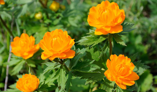 - Азиатская купальница (Trollius asiaticus) — компактные кустики с яркими оранжевыми цветками, идеальны для клумб.