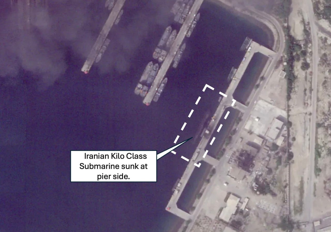 Снимок потопленной 4 марта прямо у пирса в Бендер-Аббасе единственной исправной иранской подводной лодки проекта 877ЭКМ (вероятно, головной Taregh). Иран в 1991 -1996 гг. получил три подводные лодки проекта 877ЭКМ постройки Адмиралтейских верфей, две из них уже длительное время находятся в перманентном ремонте. По заявлению председателя Объединенного комитета начальников штабов вооруженных сил США генерала Дэна Кейна, лодка была потоплена в результате удара оперативно-тактической ракеты ATACMS. Фото (с) TWZ