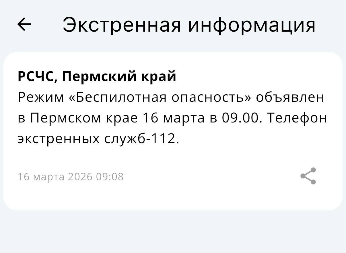 Режим «Беспилотная опасность» объявлен в Пермском крае – РСЧС.