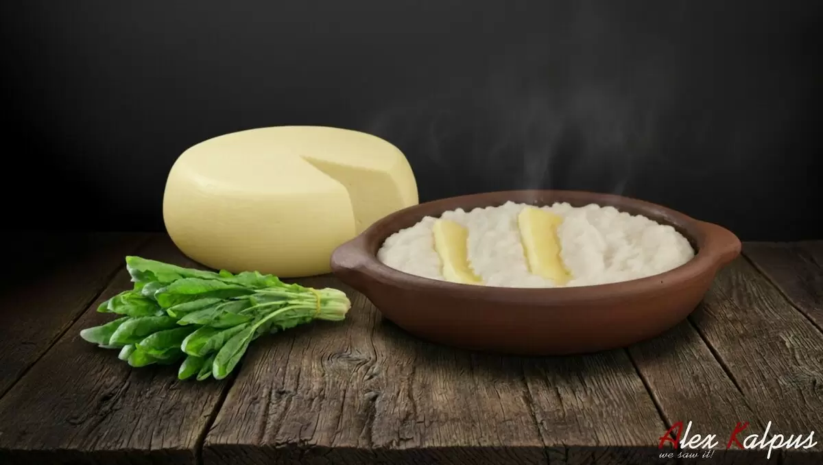 - Ингредиенты: Для аутентичного гоми используется белая кукурузная крупа — 1 кг, кукурузная мука — 4-5 ст. л. для загущения, вода — 4-5 литров, а также соль и сыр сулугуни для подачи.