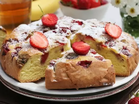Эта простая выпечка не только проста в приготовлении, но и выглядит настолько впечатляюще, что готовый пирог легко нарезается и не крошится, что облегчает подачу. С каждым укусом раскрывается сладость клубники и банана, а текстура теста добавляет легкости и свежести.