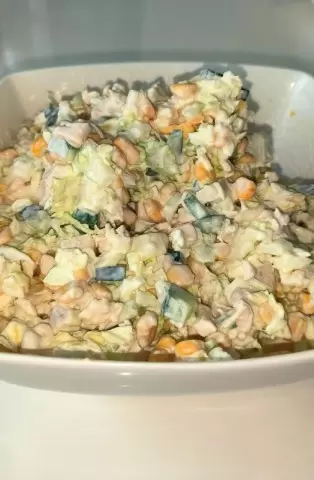 Подавайте салат холодным или при комнатной температуре. При желании можно украсить зеленью для более яркого визуального эффекта. Если вы любите остроту, можно добавить мелко нарезанный зубчик чеснока для улучшения вкусовых качеств.