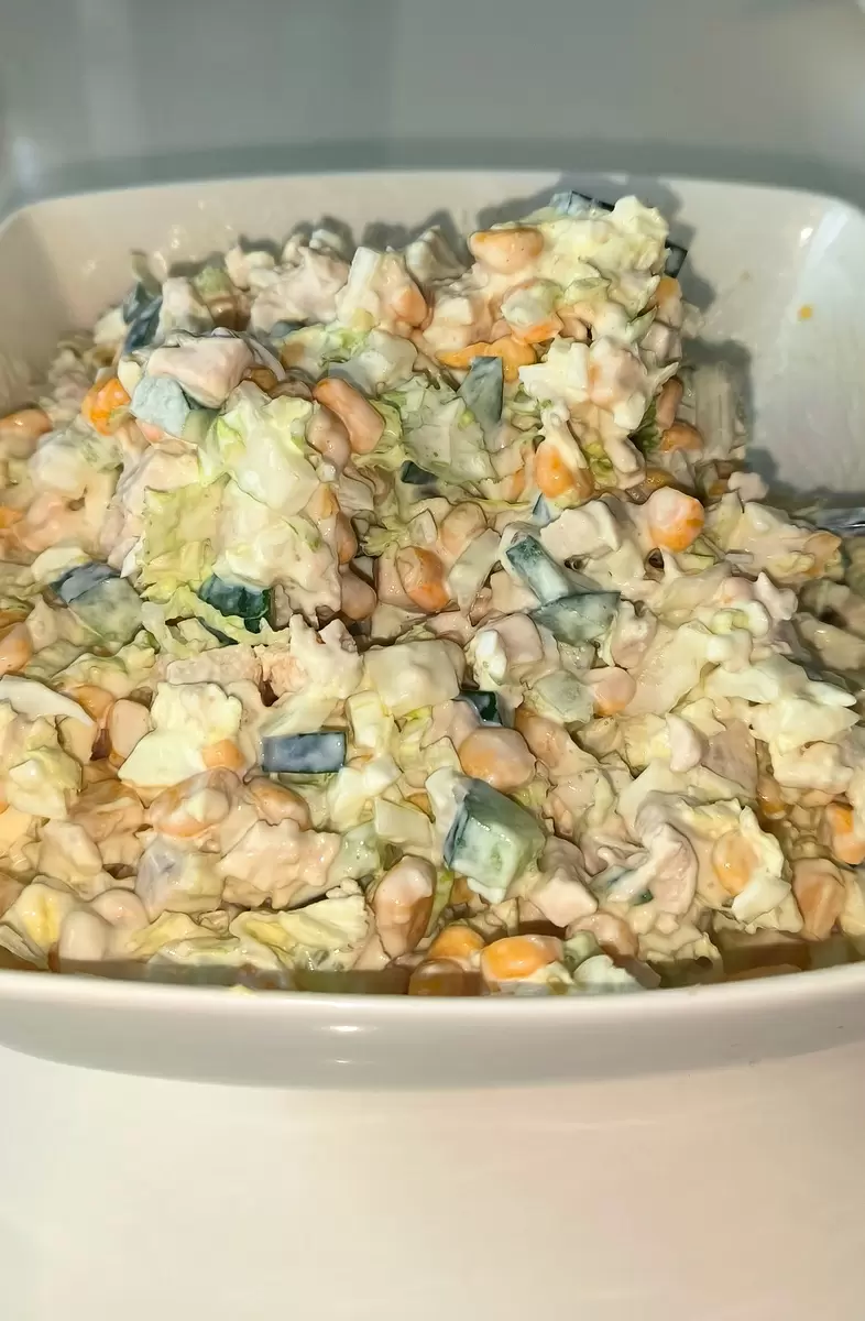 В большой миске соедините капусту, курицу, яйца, огурцы и кукурузу. Добавьте майонез по вкусу, посолите и поперчите. Тщательно перемешайте.