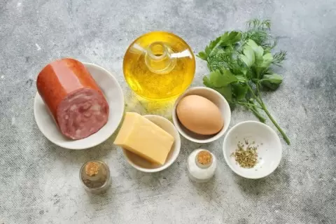 Начать стоит с подготовки всех ингредиентов. Ветчину необходимо нарезать тонкой соломкой или натереть на крупной терке, а зелень промыть и мелко порезать. Затем яйца следует разбить в чашу и немного взбить венчиком — просто до однородного состояния.