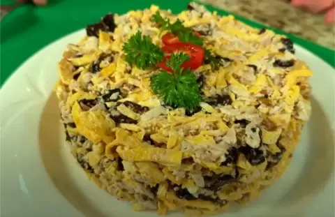 Смешайте все ингредиенты: мясо, омлеты, орехи и чернослив. По вкусу добавьте соль и перец. Этот простой, но утонченный салат не только украсит ваш стол, но и станет любимым в вашей семье.