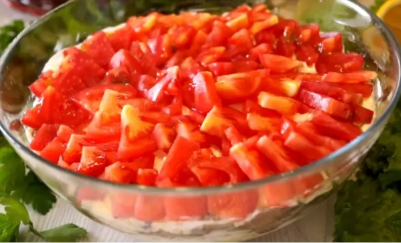 В завершение, нарежьте помидоры полукольцами и укладите их как финальный слой, чтобы добавить свежести и яркости салату. Чтобы помидоры не выделяли сок, рекомендуется удалить семена.