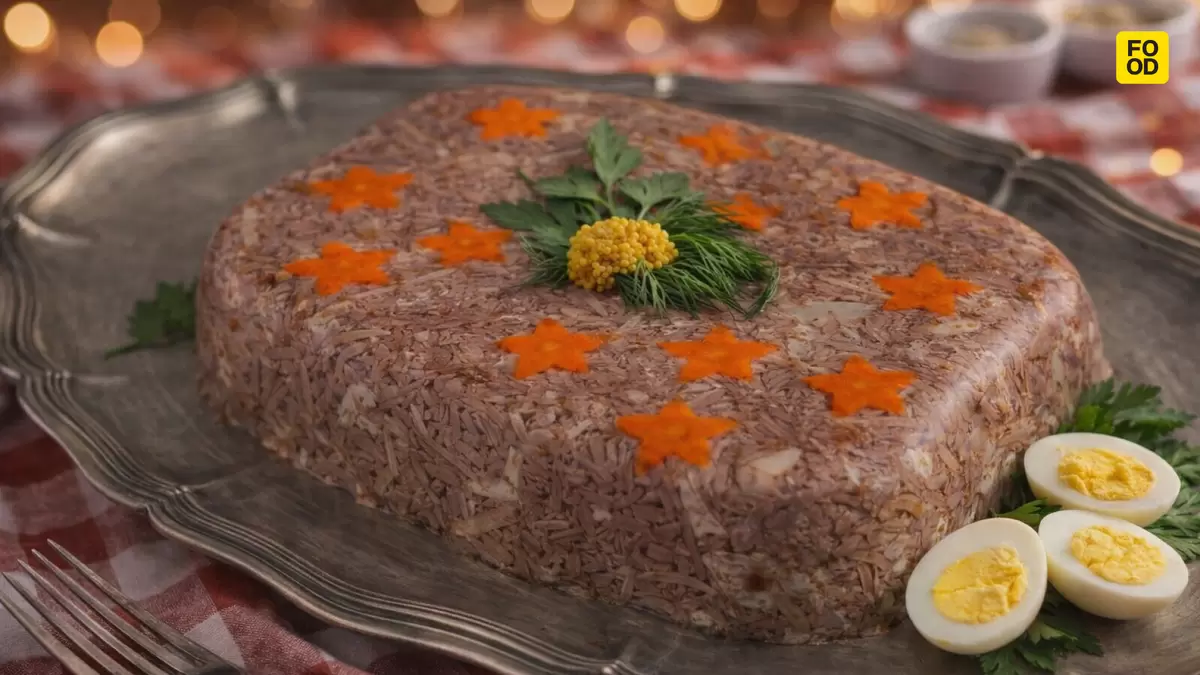 Приготовление: Замочите мясо в соленом растворе, затем обожгите и варите. Добавьте специи и дайте настояться. Выложите волокна в форму и залейте бульоном.