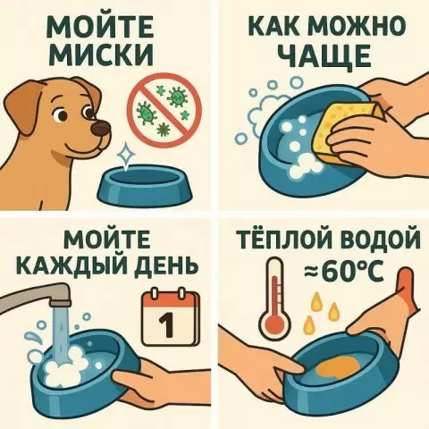 - Отдельная губка — рекомендуется использовать специальную губку или щетку для мытья мисок, чтобы не переносить бактерии.