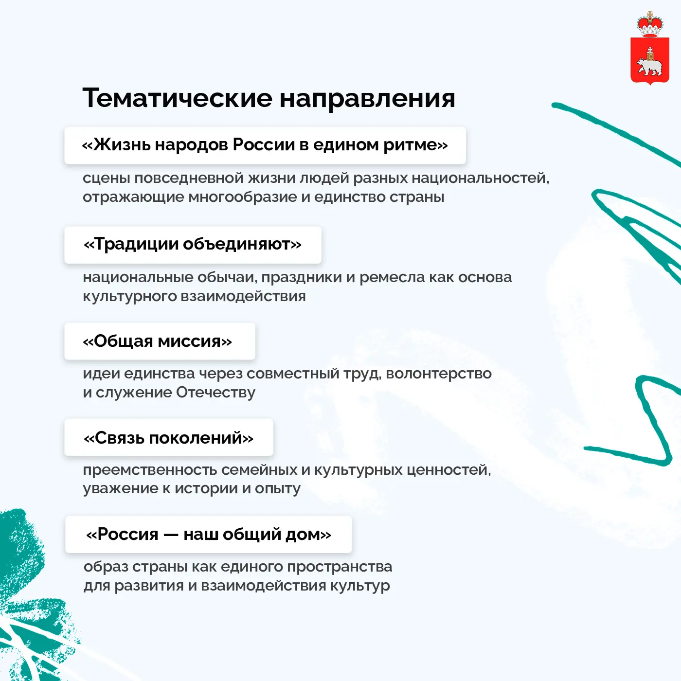 В 2026 году тема фестиваля — укрепление межнационального согласия, мира и взаимного уважения между народами России. Работы принимаются по пяти направлениям: от повседневной жизни разных народов и традиций до идеи единого культурного пространства страны.
