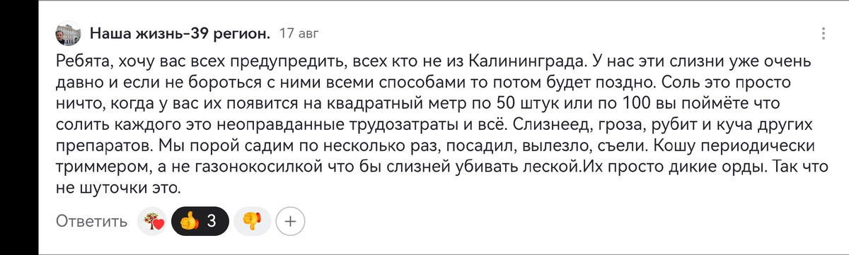 Кроме того, многие садоводы отмечают, что механический сбор слизней остается одним из самых безопасных и эффективных методов. Не каждый готов прибегать к химическим веществам, и именно ручной способ позволяет минимизировать ущерб окружающей среде.