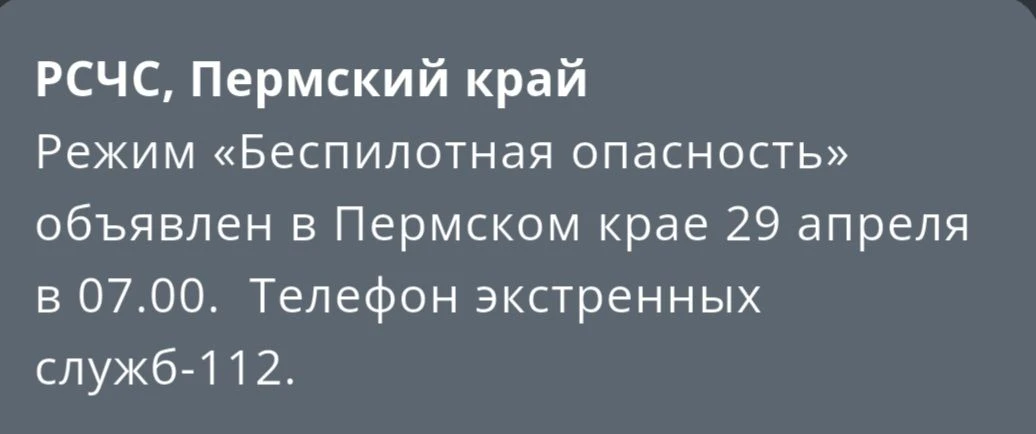- В Пермском крае введен режим «Беспилотная опасность» Все оперативные службы оповещены и находятся в полной готовности. Номер вызова экстренных служб — 112. Подписывайся на МЧС России в MAX | ВК// МЧС Пермского края