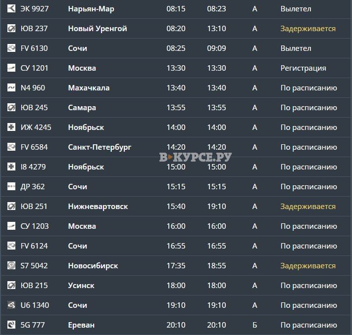 Рейс в Новый Уренгой должен был состояться сегодня в 08:20, но был перенесён на 13:10. В пресс-службе транспортной прокуратуры сообщили, что это связано с поздним прилётом самолёта в Пермь.Также задерживаются рейсы:Нижневартовск — Пермь (перенесён с...