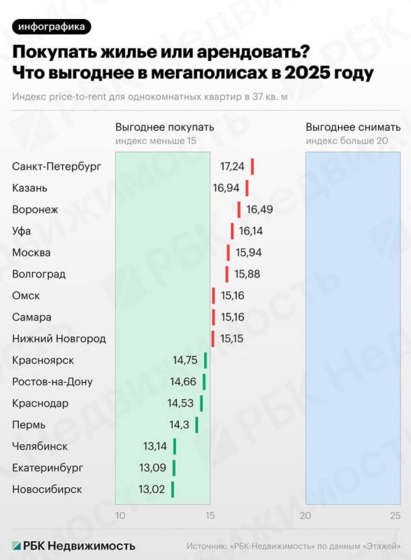 На начало ноября 2025 года индекс price-to-rent в российских городах-миллионниках составил 14,39, что означает, что жильё выгоднее покупать, а не снимать.Почти половина мегаполисов (Новосибирск, Екатеринбург, Челябинск, Пермь, Краснодар...